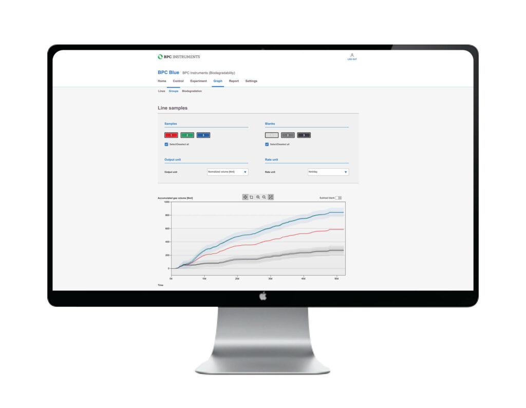 - 實時生物降解率計算:無需手動處理數據,BPC Blue將在實驗過程中自動進行計算,讓用戶體驗實時計算生物降解率的便利。